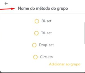 Dentro do plano de treino clique no sinal de + e irá subir as opções, clique em grupo de exercícios e escolha o metodo que deseja.